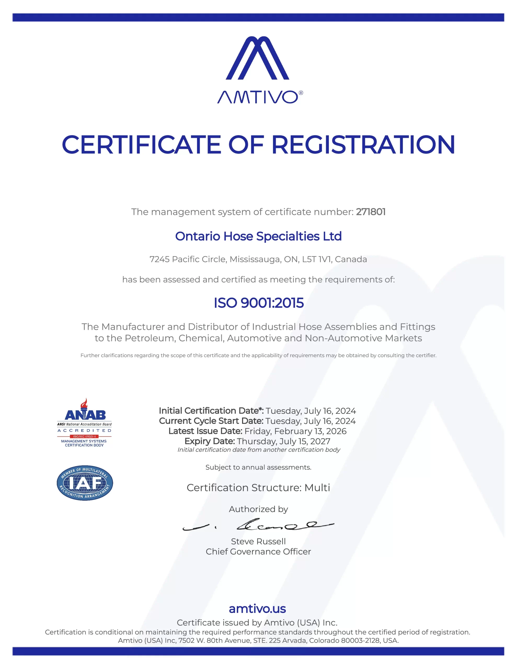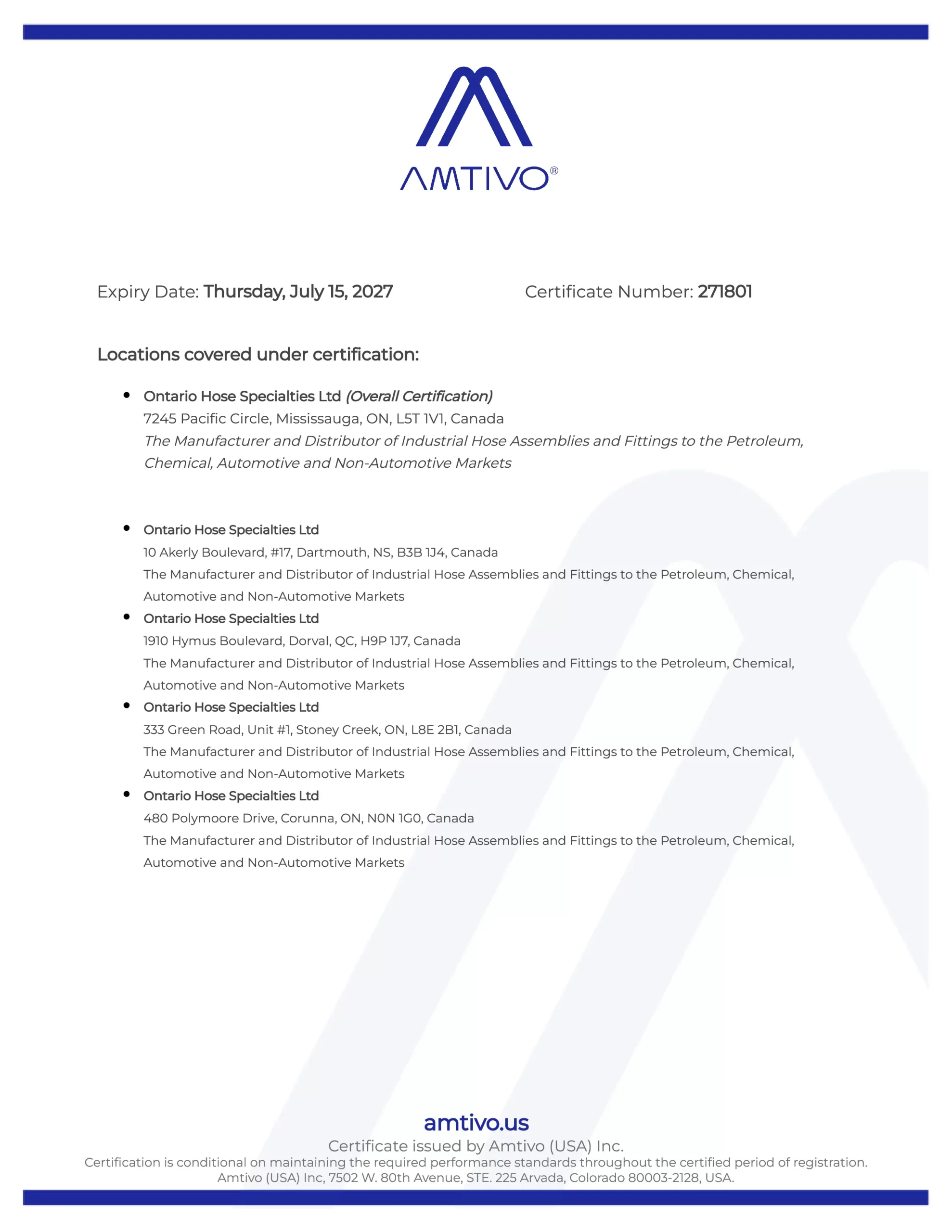 it is the internationally recognized standard for quality management systems (QMS). This standard showcases Ontario Hose Specialties Ltd.’s commitment to consistently providing products and services that meet both customer and regulatory requirements. By utilizing a robust framework, it drives organizations toward excellence through a focus on customer satisfaction, process efficiency, and continuous improvement.