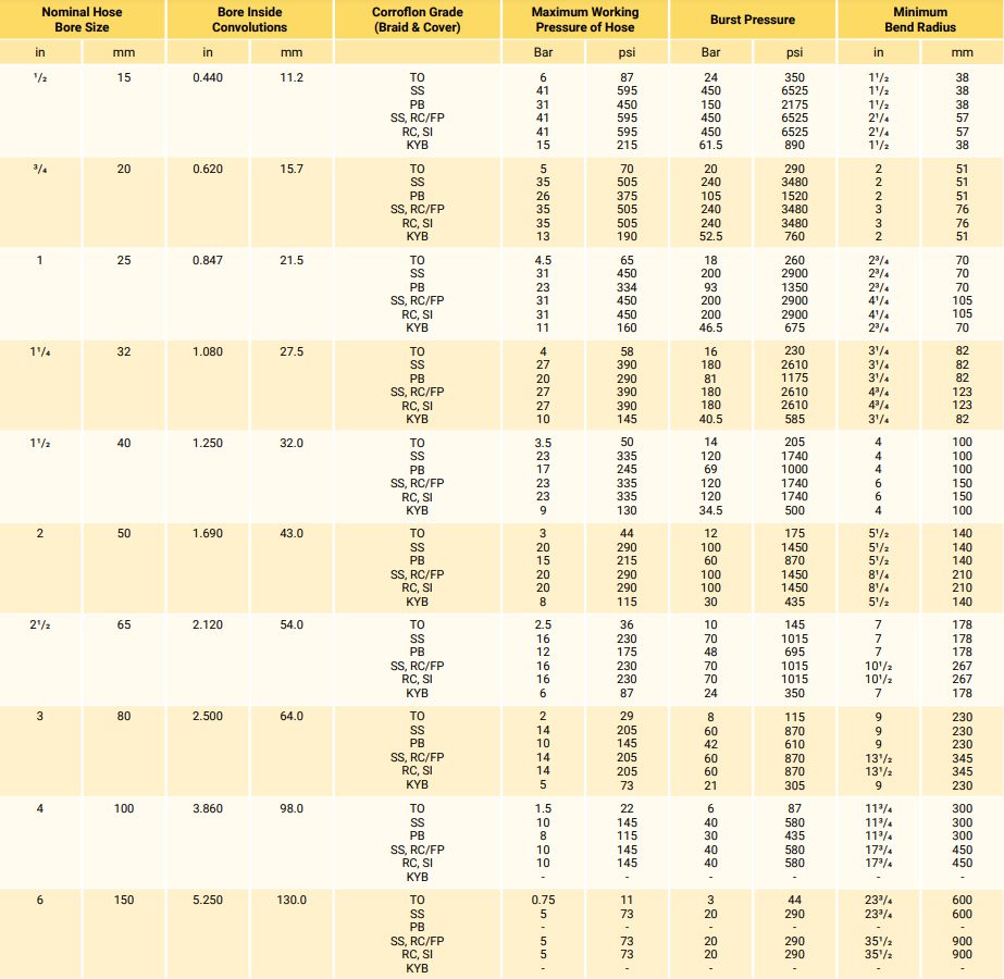 FOR SS BRAIDED 595 PSI (41 BAR) FOR 1/2”, TO 290 PSI (20 BAR) FOR 2” DEPENDANT UPON TEMPERATURE