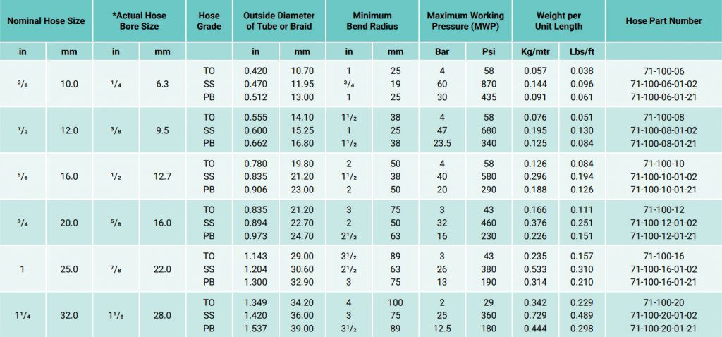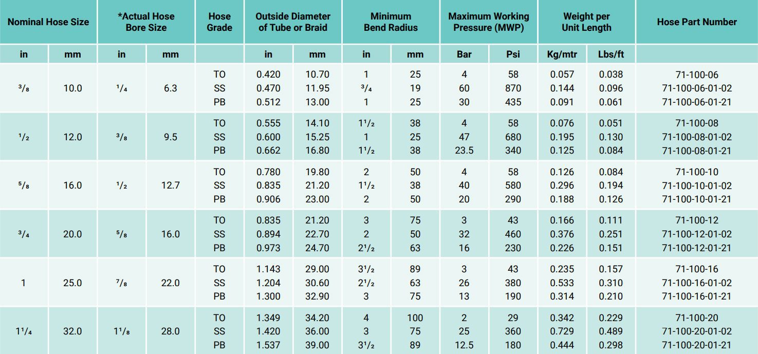 WORKING PRESSURE RATINGS – (stainless steel braided hose) 3/8” (10MM) = 870 PSI (60 BAR) TO 11/4” (32MM) = 25 BAR (360 PSI)
