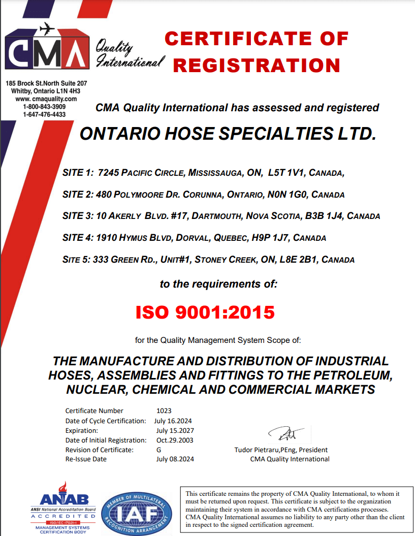 it is the internationally recognized standard for quality management systems (QMS). This standard showcases Ontario Hose Specialties Ltd.’s commitment to consistently providing products and services that meet both customer and regulatory requirements. By utilizing a robust framework, it drives organizations toward excellence through a focus on customer satisfaction, process efficiency, and continuous improvement.
